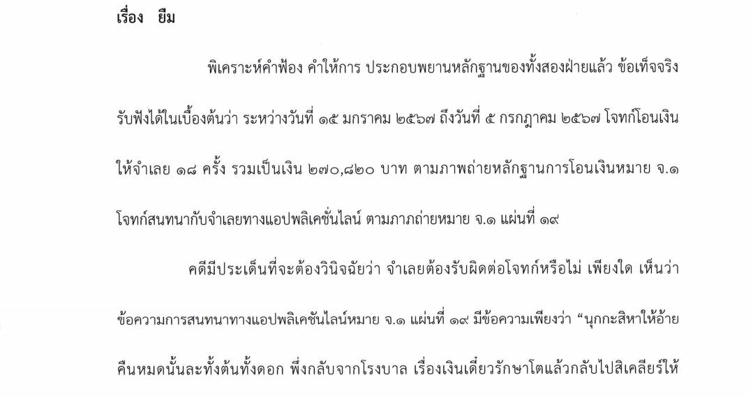 เรื่องมีอยู่ว่า โจทก์ (ผู้ฟ้อง) อ้างว่าได้โอนเงินให้จำเลย 18 ครั้ง รวม 270,820 บาท โดยเชื่อว่านั่นคือการให้กู้ยืมเงิน และนำสลิปการโอนเงินพร้อมข้อความแชทจาก ไลน์ มายืนยัน ฝั่งจำเลยสู้คดีว่า “ไม่เคยกู้เงิน” และแชทที่ปรากฏก็ไม่ได้พูดถึงเรื่องการยืมหรือการตกลงกู้ยืมเงินแต่อย่างใด