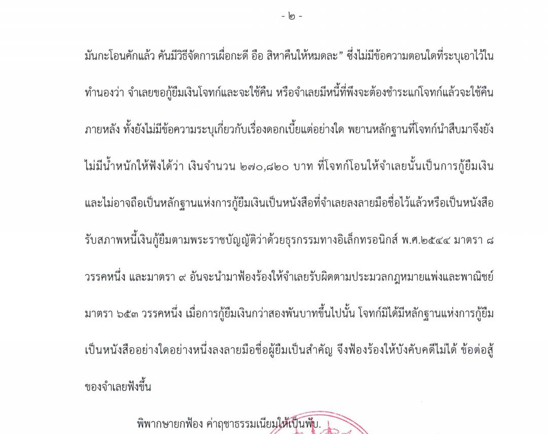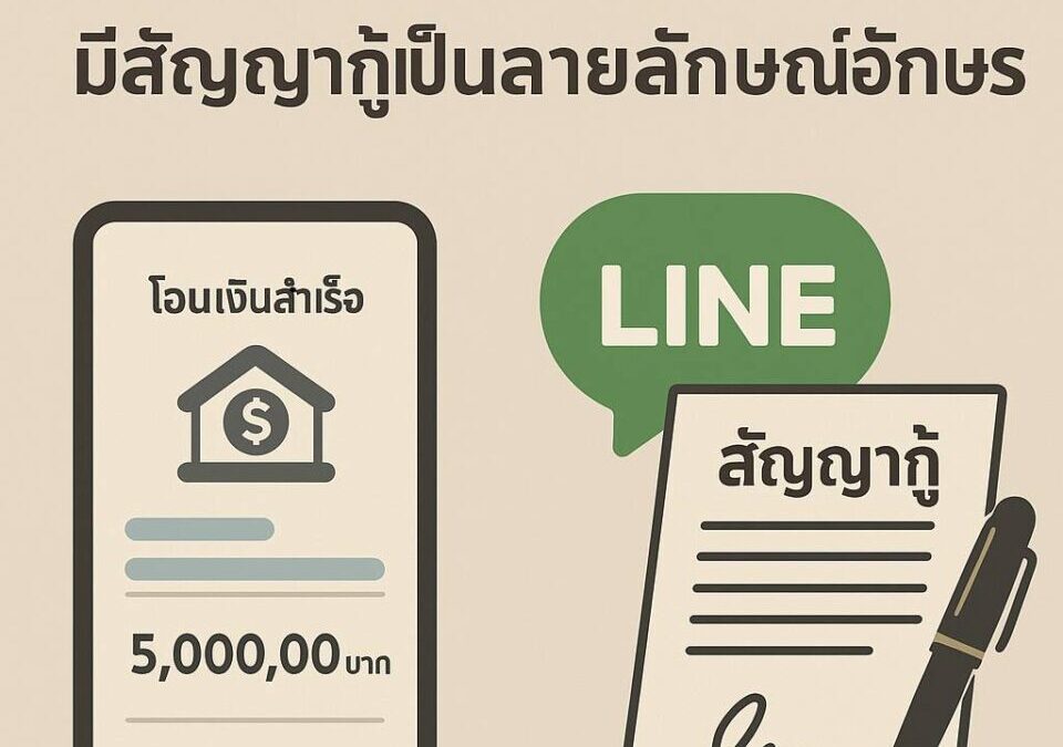 ประเด็นที่ศาลพิจารณา เมื่อพิจารณาข้อความจากแชทไลน์ ศาลพบว่า มีเพียงการพูดคุยทั่วไป เช่น “จะหาคืนให้หมด” หรือ “เรื่องเงินเดี๋ยวรักษาตัวก่อนแล้วค่อยเคลียร์” ซึ่งฟังดูคลุมเครือ และ ไม่ได้แสดงเจตนาชัดเจนว่ามีการกู้ยืมเงิน ที่สำคัญ ตามประมวลกฎหมายแพ่งและพาณิชย์ มาตรา 653 วางหลักไว้ว่า หากเป็นการกู้เงินกว่า 2,000 บาทขึ้นไป ต้องมี “หลักฐานเป็นหนังสือที่ผู้กู้ลงลายมือชื่อ” จึงจะฟ้องร้องบังคับคดีได้ แม้ปัจจุบันจะมีกฎหมาย พรบ.ว่าด้วยธุรกรรมทางอิเล็กทรอนิกส์ พ.ศ. 2544 ที่รับรองว่าเอกสารอิเล็กทรอนิกส์สามารถใช้แทนหนังสือได้ แต่ก็ยังต้องมีการ “ลงลายมือชื่อทางอิเล็กทรอนิกส์” ที่แสดงถึงเจตนาอย่างชัดเจน ซึ่งในกรณีนี้ ข้อความในไลน์ ยังไม่ถึงเกณฑ์นั้น